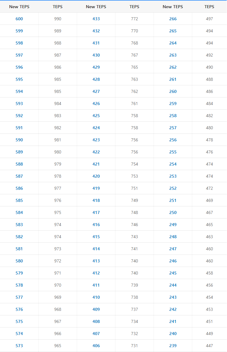 <뉴텝스 ↔ 텝스 점수 환산표>