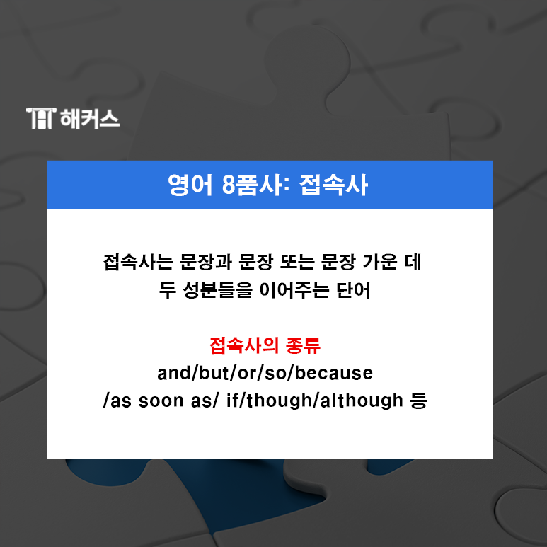 접속사는 문장과 문장 또는 문장 가운 데 두 성분들을 이어주는 단어입니다.