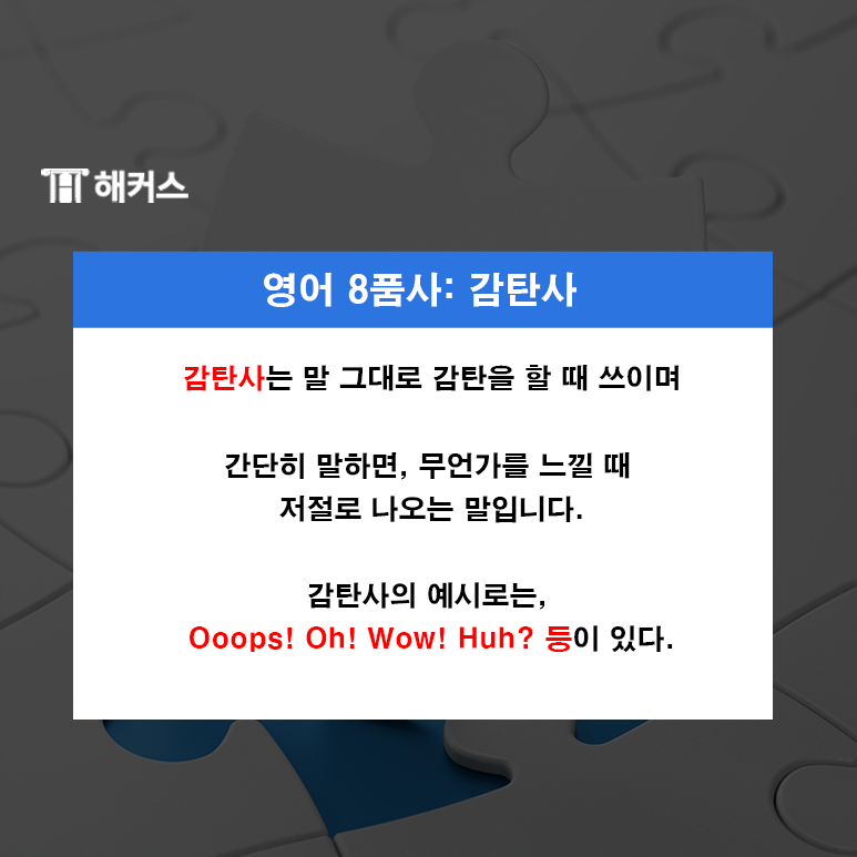 감탄사의 예시로는, Ooops! Oh! Wow! Huh? 등이 있습니다.