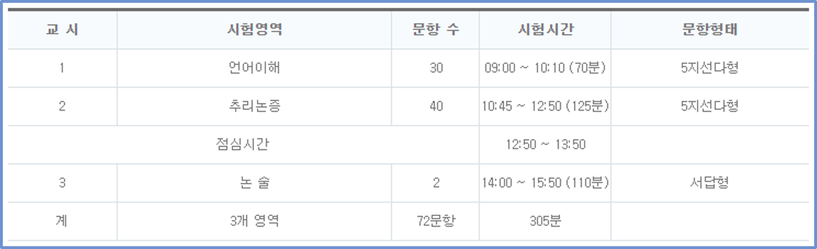 리트 시험은 다양한 학문 영역에 관련된 소재를 활용하여 문제를 통합적으로 출제하고 있는데요. 언어이해, 추리논증, 논술 3가지 영역으로 구성되어 있으며, 언어이해 및 추리논증은 5지선다형 객관식 문제로 출제되며 논술은 서답형으로 답안을 작성해야 합니다. 각 과목별 문항 수와 시간이 다르니 위 표를 통해 자세히 확인해보시기 바랍니다.