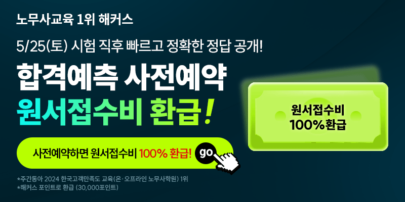 또한 사전예약만 해도 원서접수비를 해커스 포인트로 100% 환급해드리며, 8/31(토)~9/1(일)에 진행되는 2차 시험을 대비할 수 있는 유료 특강까지 무료로 받아보실 수 있으니 해커스노무사 풀서비스를 통해 빠른 정답 확인은 물론 다양한 혜택을 받아보시기를 추천드립니다.