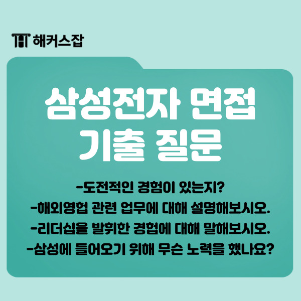 먼저, 도전적인 경험이 있는지?에 대해 질문하고 있어요. 도전적인 경험을 한 구체적인 사례를 지원한 직무와 연관지어 답변할 수 있으면 좋을 것 같아요! 또 다른 삼성 직무면접 기출 질문으로는 해외영업과 관련된 업무에 대해 묻고 있어요. 해외영업팀에 지원하지 않더라도 삼성전자와 관련된 업무에 대한 구체적인 자료조사를 통해 사전에 미리 숙지해둘 필요가 있을 것 같습니다!