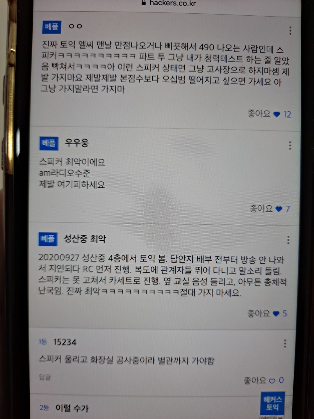 해커스토익 고사장정보 게시판에서 확인할 수 있으니