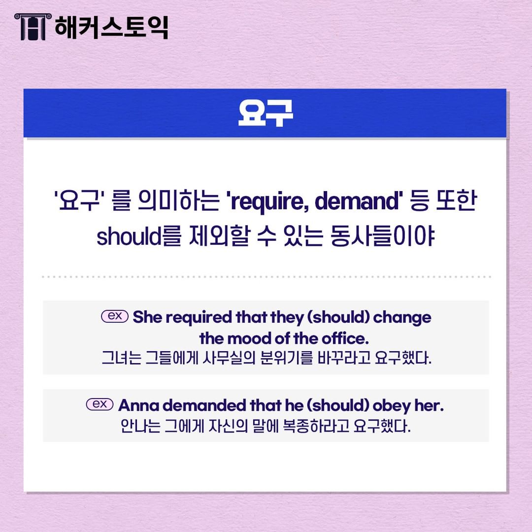 '요구'를 의미하는 'require, demand' 등이 should를 제외할 수 있는 동사들이에요