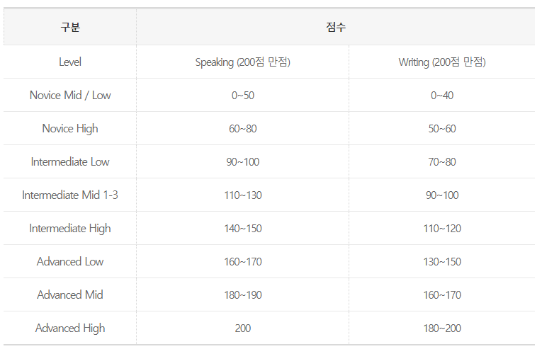 레벨별 점수가 나와있으니까 본인의 토익스피킹 목표 점수 설정한다면
