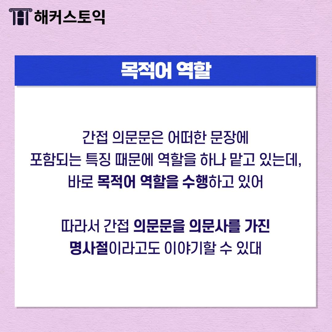 간접 의문문은 목적어 역할을 수행하기도 한답니다