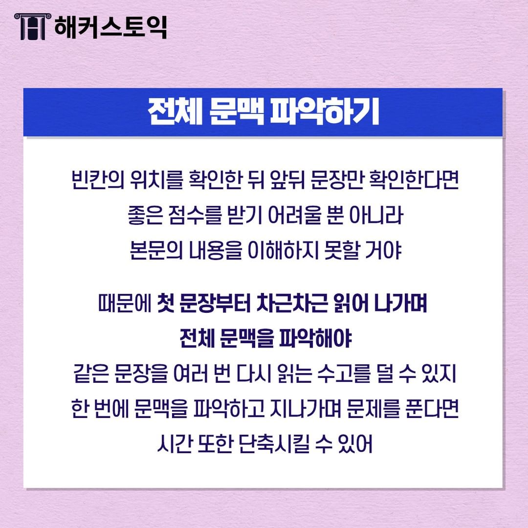문장을 읽으면서 전체 문맥을 파악해야 한답니다!
