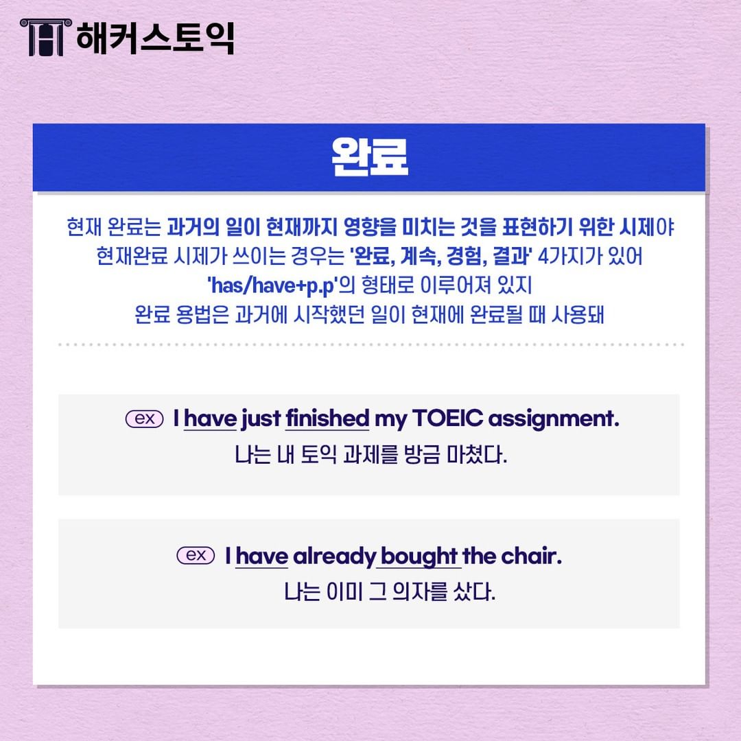 현재 완료는 과거의 일이 현재까지 영향을 미치는 것을 표현하기 위한 시제랍니다!