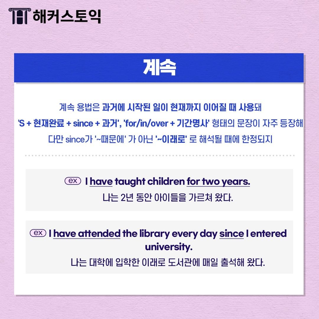 계속 용법은 과거에 시작된 일이 현재까지 이어질 때 사용돼요