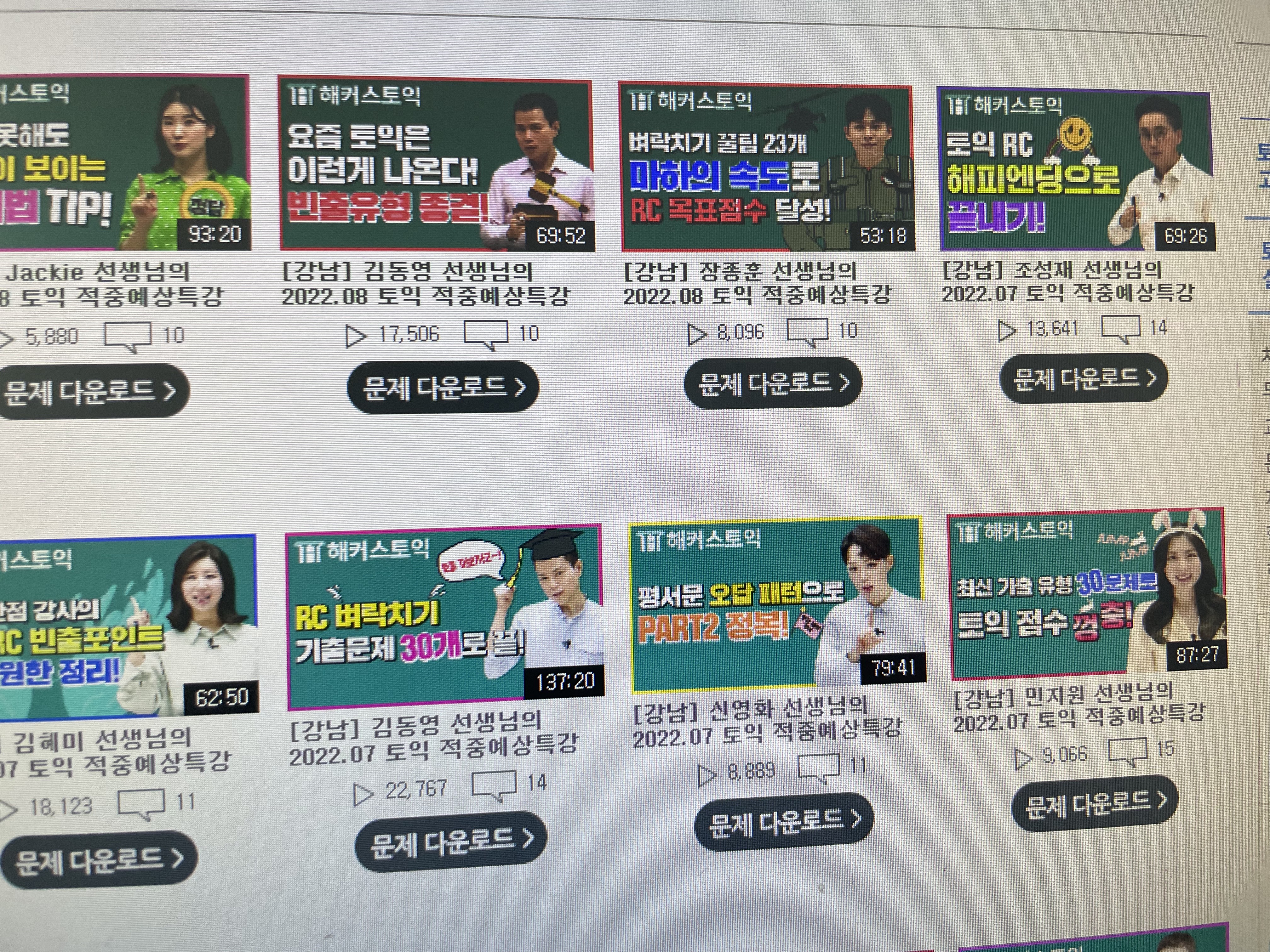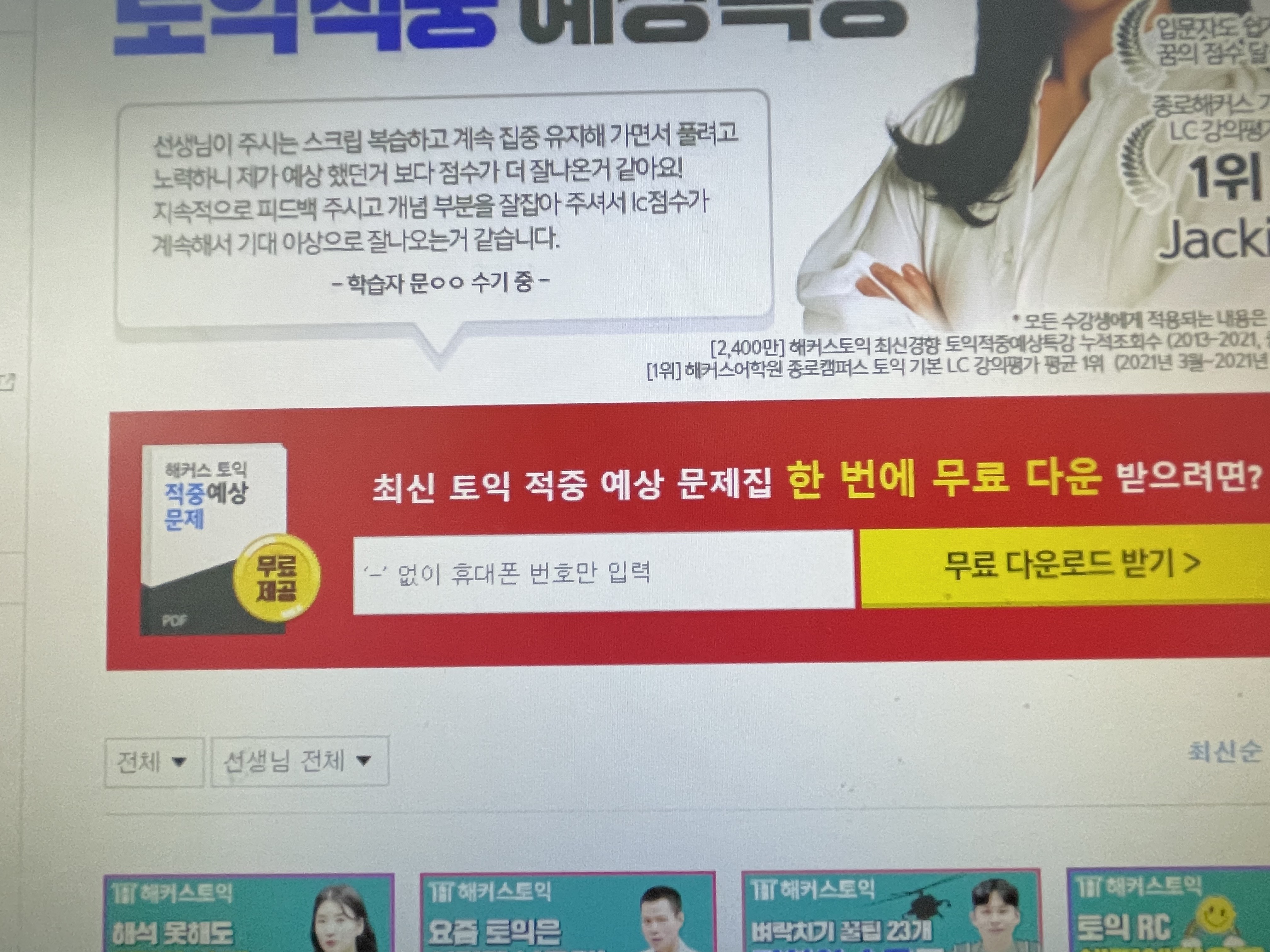 토익점수도 알고 파트별 틀린문제수도 분석했다면, 원하는 토익점수를 받아서 졸업하셨다면 이대로 토익 접으시면 되겠지만, 아직도 부족해서 다음 토익시험을 준비하셔야 하는 분들은 주목해주세요! 토익시험을 대비해서 공부할 수 있는 무료 콘텐츠, 토익적중예상특강을 소개해드리겠습니다. 해커스토익에서 가장 유명하고 유익한 무료콘텐츠 입니다. 해커스 학원 선생님들께서 매달 토익시험 최신유형을 반영해서 문제와 해설강의를 무료로 제공해주십니다. 이 꿀자료를 안 풀고 그냥 지나칠 수는 없겠죠? 특히 최신유형과 토익시험에 잘 나오는 문법, 단어를 위주로 다줘주시니까 본 사람과 안 본 사람의 차이는 크다고 생각합니다.