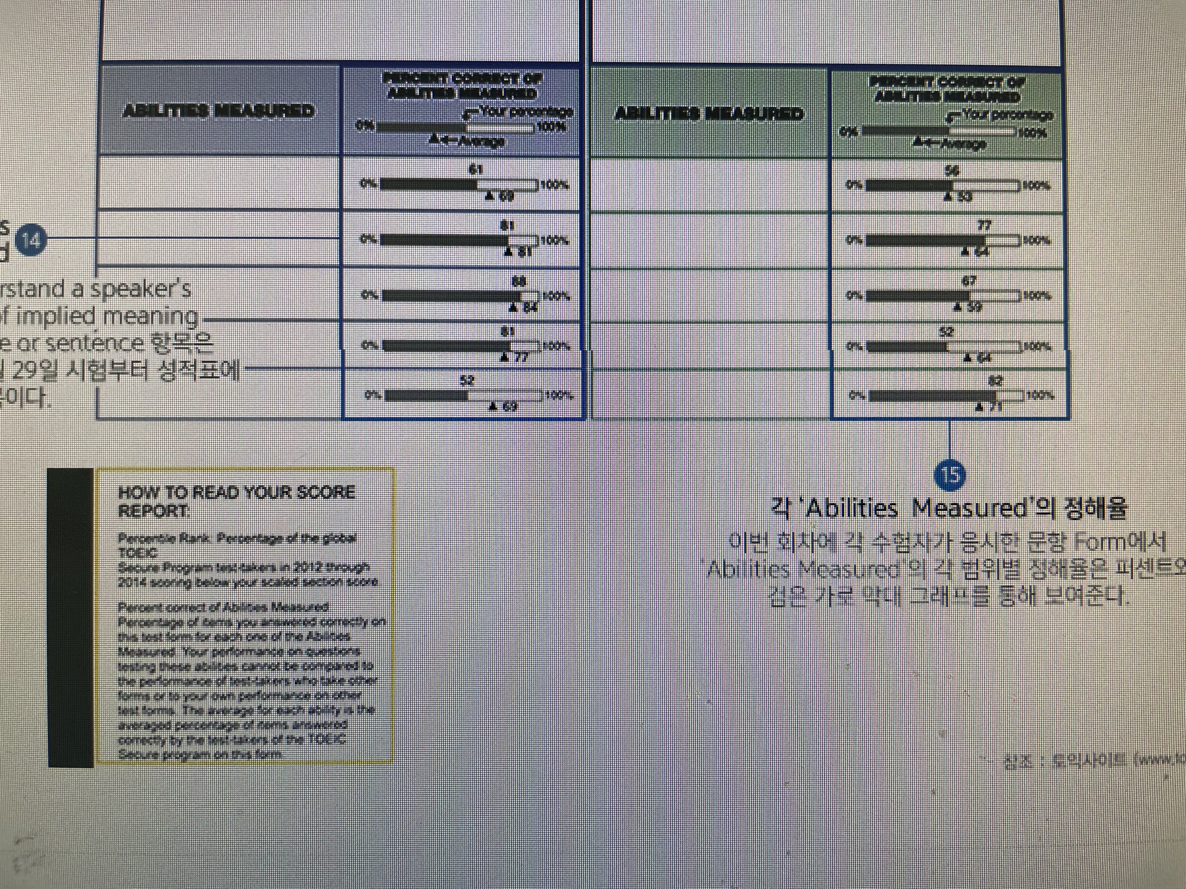 결과창을 보시면, 시험일자와 틀린문제 수 전체를 보여줍니다. 먼저 파트별 틀린 문제수를 알려주는데요. 여기서 내가 가장 많이 틀린파트를 중점적으로 공부하면서 다음시험을 대비하시는 것이 좋습니다. 대체적으로 파트 3&4에서 많이 틀리고, 파트7에서 많이 틀리더라구요. 아마 파트7은 문제를 다 풀지 못해서 틀리는 경우에 많을것이라고 생각합니다. 그리고 항목별 틀린 문제수를 알려줍니다. 여기서 항목별은 토익성적표 하단에 나온 백분율 5가지 그 5가지 항목을 말하는 거예요! 백분율 항목이 있고 그 아래 영어로 쓰여져 있는 부분입니다.
