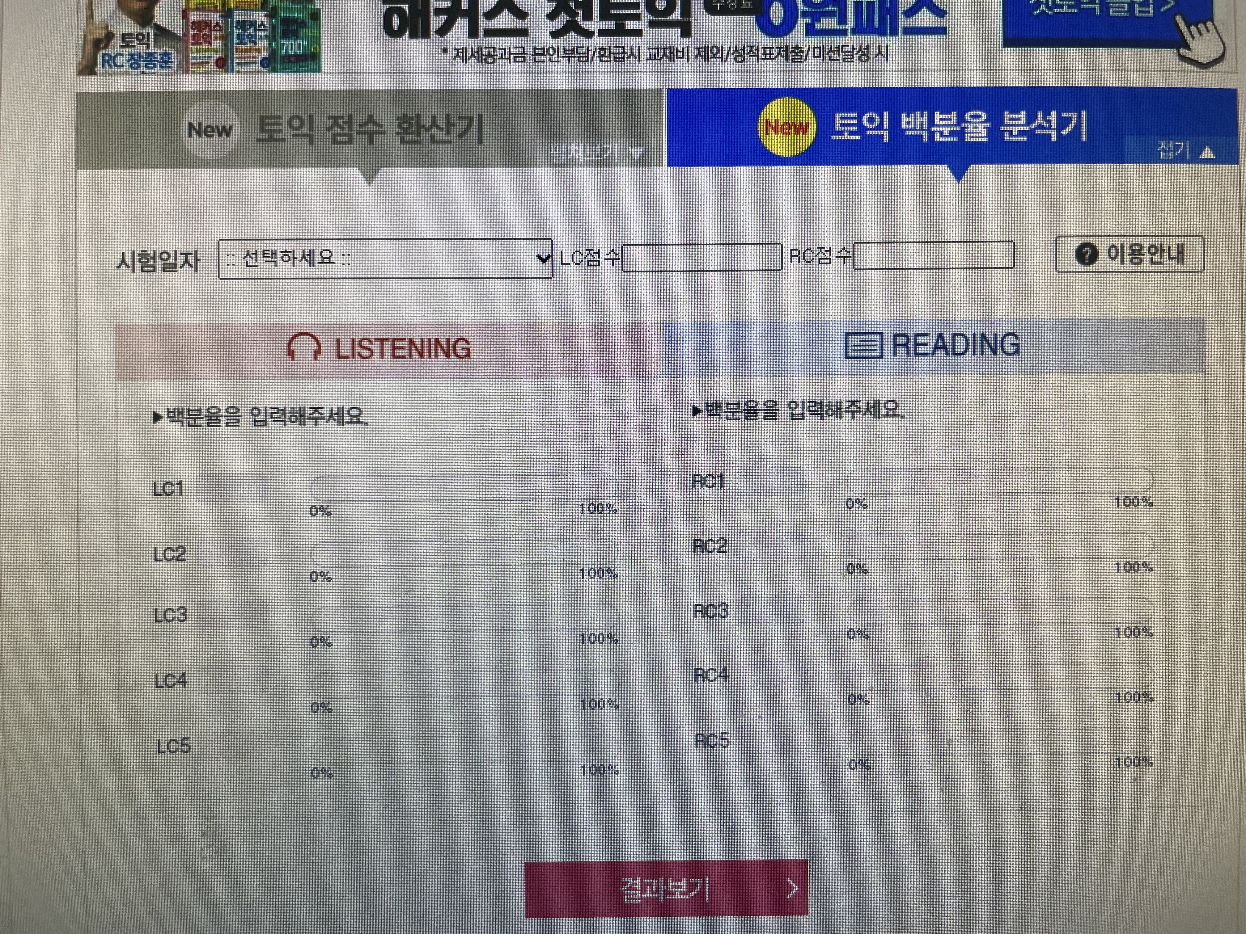 토익점수를 확인하고 토익 백분율을 확인했다면, 이제 백분율 분석기를 이용해서 틀린개수를 알아보는 법을 알려드릴게요! 시험일자를 클릭하시고, 나의 LC점수와 RC점수를 입력한다음 성적표에 나와있는 백분율을 위에서부터 순서대로 입력하시고, 분석하기 버튼을 누르시면 끝! 아주 간단한 방법으로 백분율 분석이 가능합니다. 내가 미리 답을 적고 가채점을 했다면, 틀린개수를 어느정도 알았겠지만, 아예 모르시는 분들은 이 방법을 통해서 내가 어떤 파트에서 어느정도 틀렸는지를 알 수 있습니다. 알아둬야 다음 시험을 대비하는데도 도움이 되겠죠.