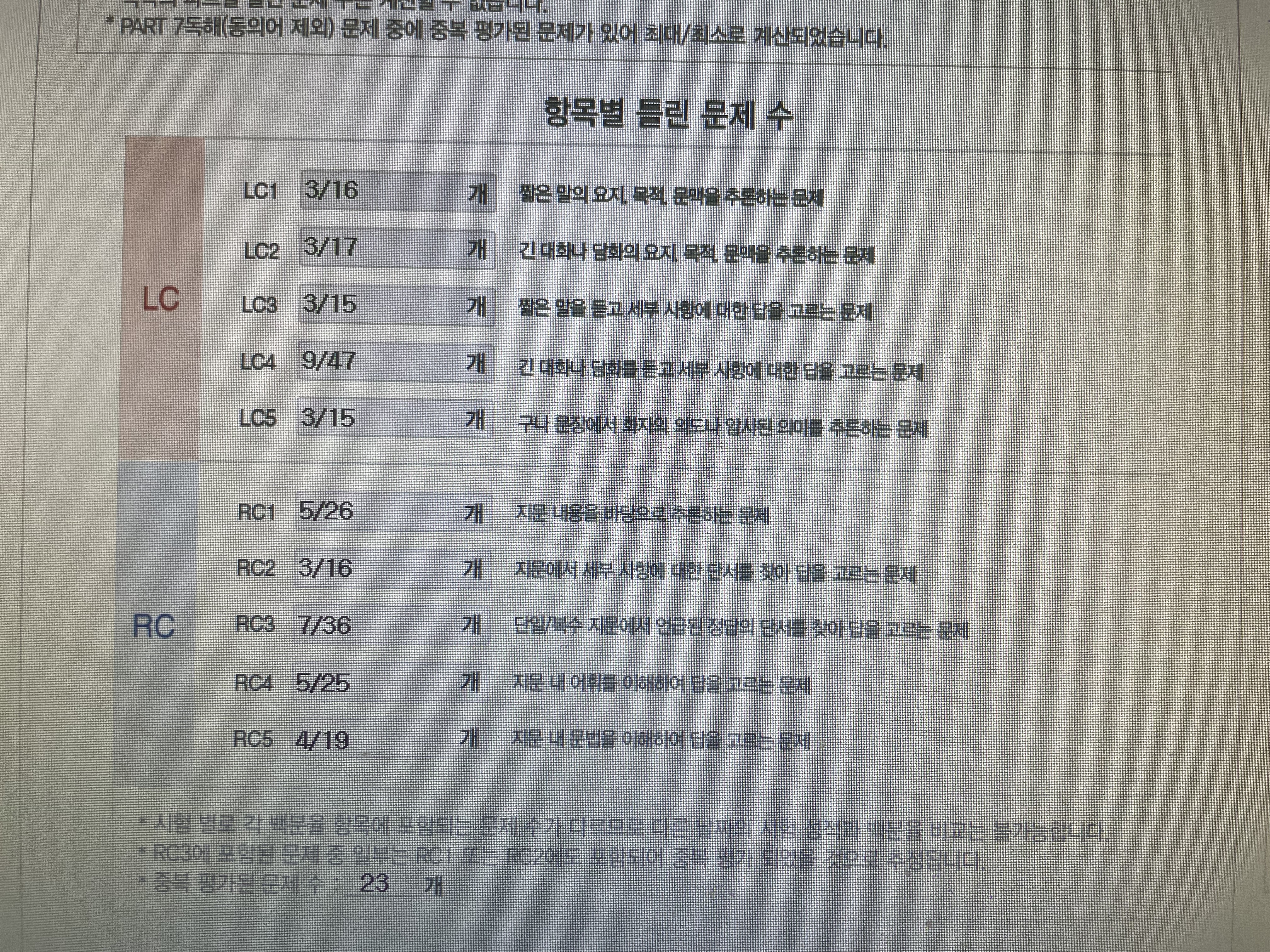 영어를 한글로 해석해서 알려드리자면, 차례대로 LC는 짧은 말의 요지, 목적, 문맥을 추론하는 문제, 긴 대화나 담화의 요지, 목적, 문맥을 추론하는 문제, 짧은 말을 듣고 세부 사항에 대한 답을 고르는 문제, 긴 대화나 담화를 듣고 세부 사항에 대한 답을 고르는 문제, 구나 문장에서 화자의 의도나 암시된 의미를 추론하는 문제입니다. RC는 지문 내용을 바탕으로 추론하는 문제, 지문에서 세부 사항에 대한 단서를 찾아 답을 고르는 문제, 단일/복수 지문에서 언급된 정답의 단서를 찾아 답을 고르는 문제, 지문 내 어휘를 이해하여 답을 고르는 문제, 지문 내 문법을 이해하여 답을 고르는 문제로 해석하여 이해하면 됩니다.