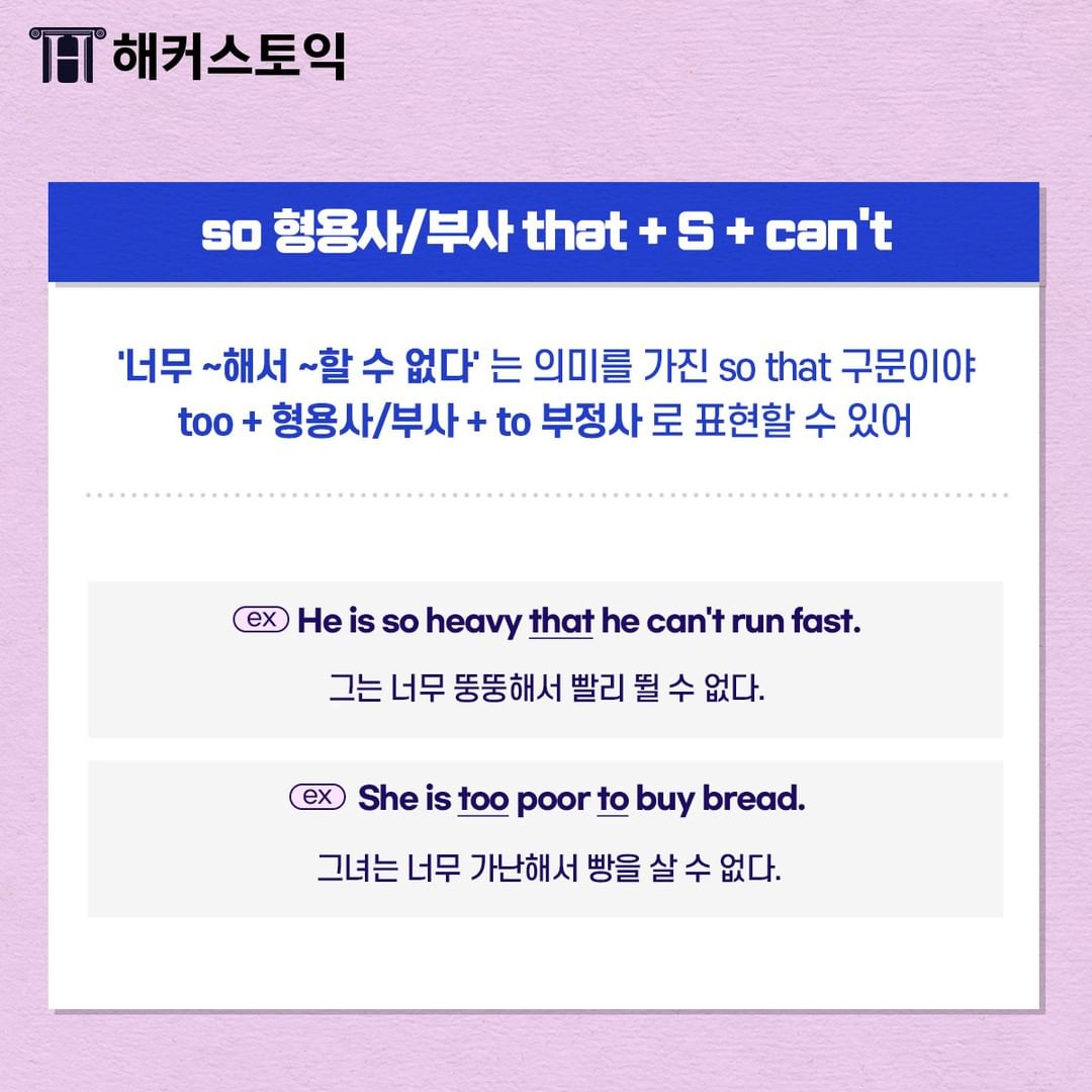 so 형용사/부사 that + S + can + V 를 대신하여 사용할 수 있답니다