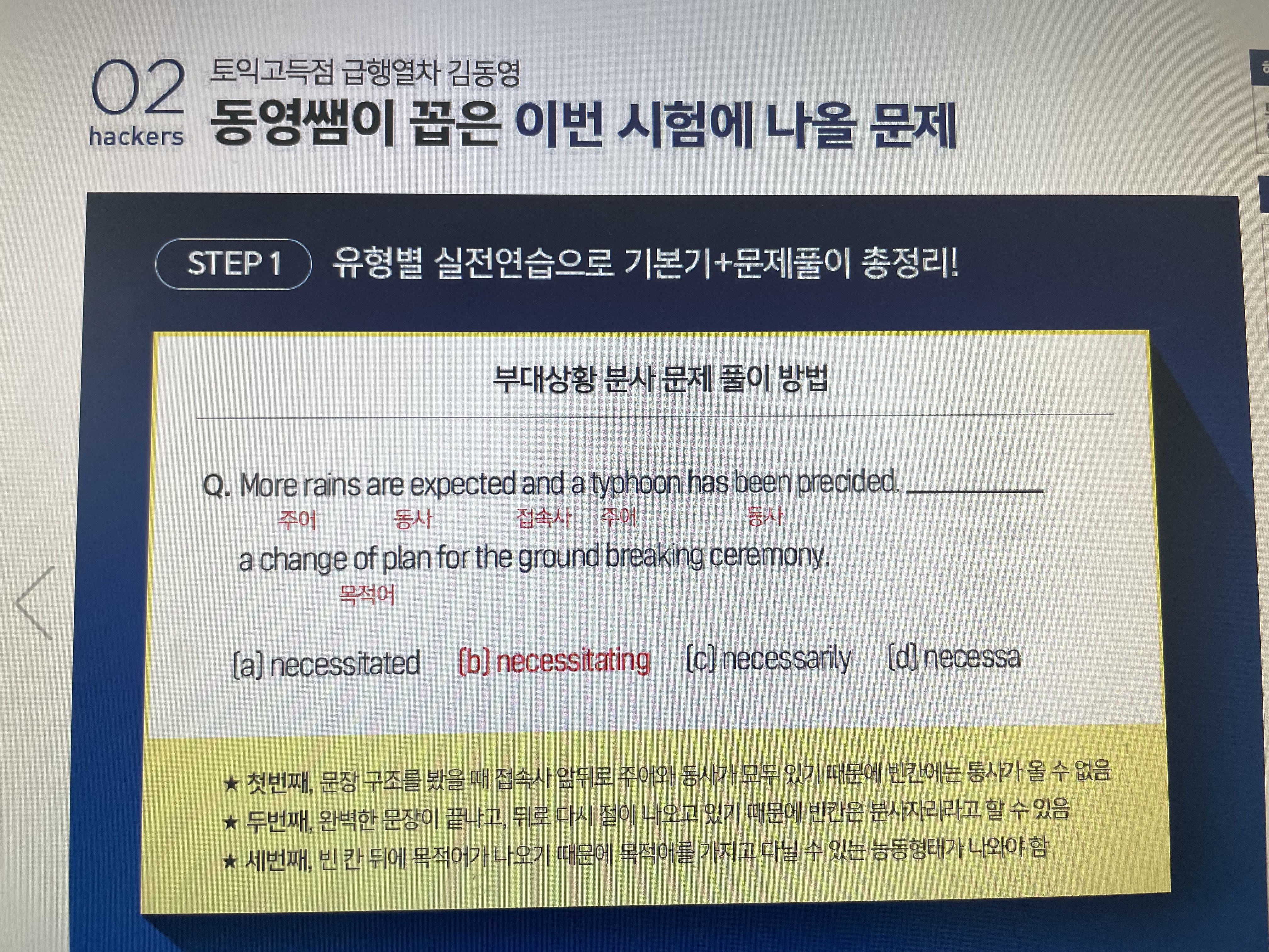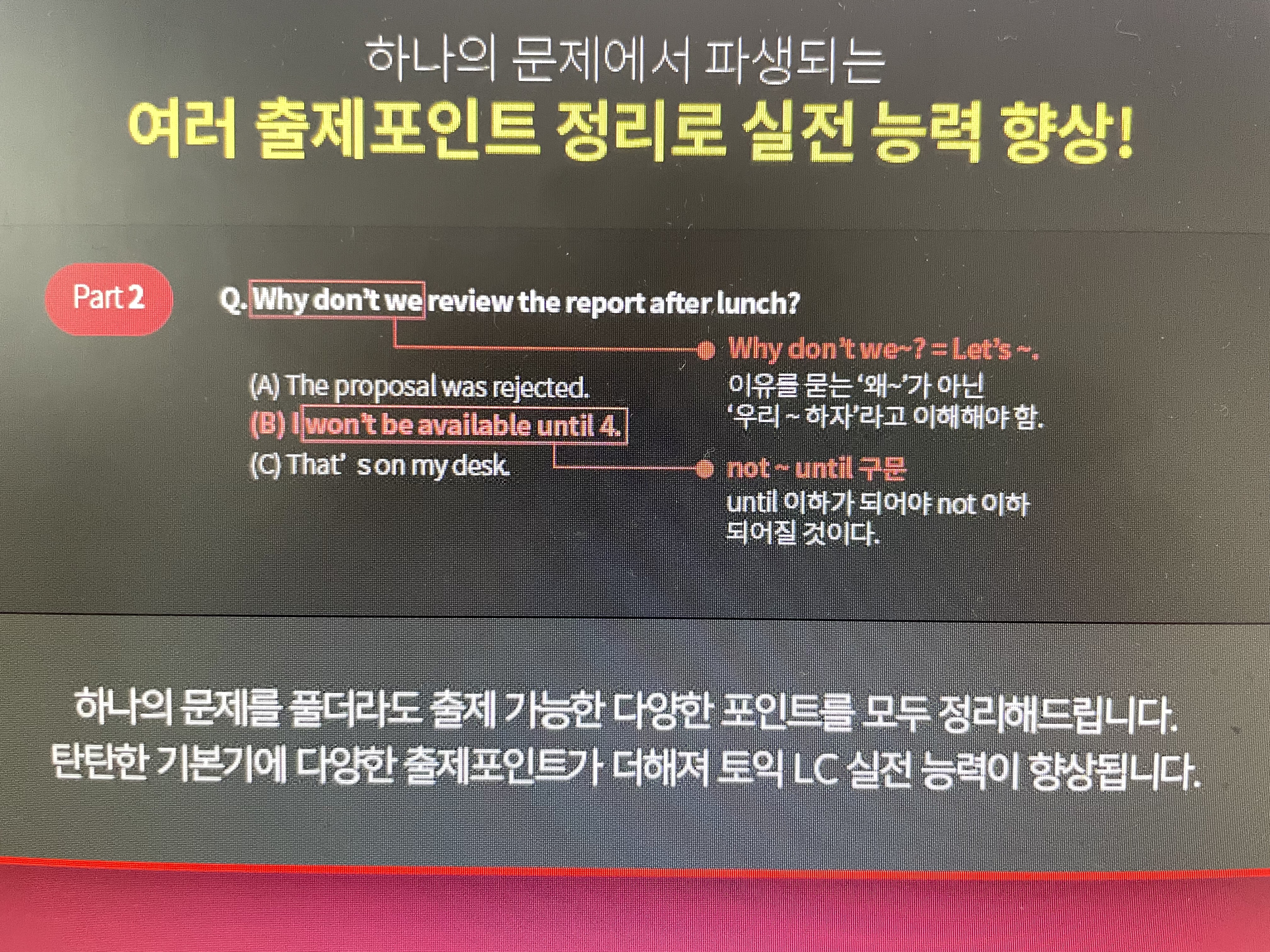 먼저, PART 1에서 풍경 사진 혹은 사람이 없는 사진이 나왔다면, 사람 명사가 있는 보기는 정답이 아니라는 것을 기억해 두시면 좋습니다. 이와 함께, 보기에 betbeing+p.p 구문이 들어간 문장이 있다면 '주어 (사물)가 p.p되고 있다. (by 사람)'이라는 뜻이기 때문에 풍경 사진이나 사람이 없는 사진에서는 정답이 아닙니다. PART 2에서 고득점을 받기 위해서는 영어가 한글로 바로 해석되는 직청직해가 가장 중요합니다. 직청직해는 영어를 그대로 따라 읽는 쉐도잉으로 연습하는 것이 가장 좋은 방법이지만, 짧은 시간동안 직청직해를 연습할 시간이 부족하다면, 앞 부분에 중요한 내용이 많이 나오니 이 부분을 집중해서 들어주는 것이 좋습니다.