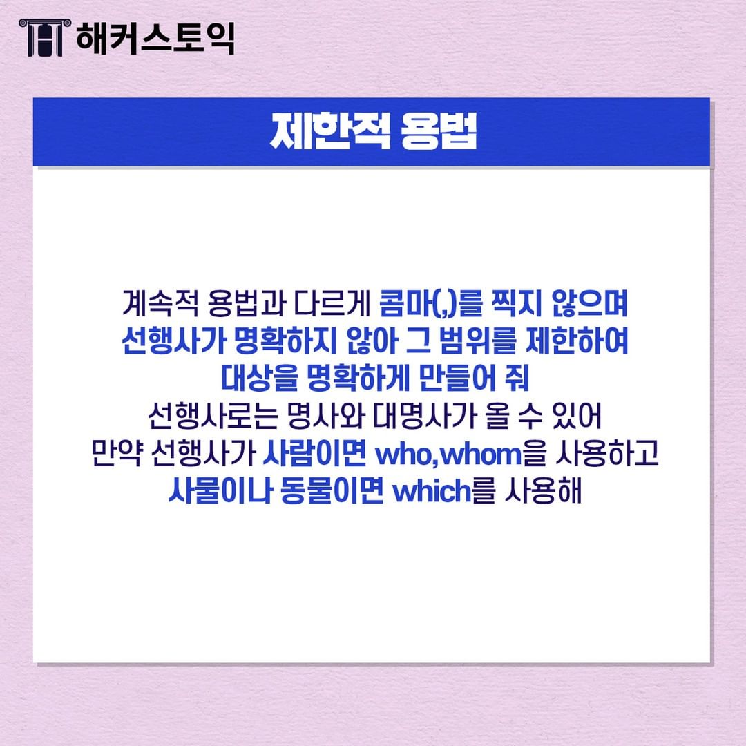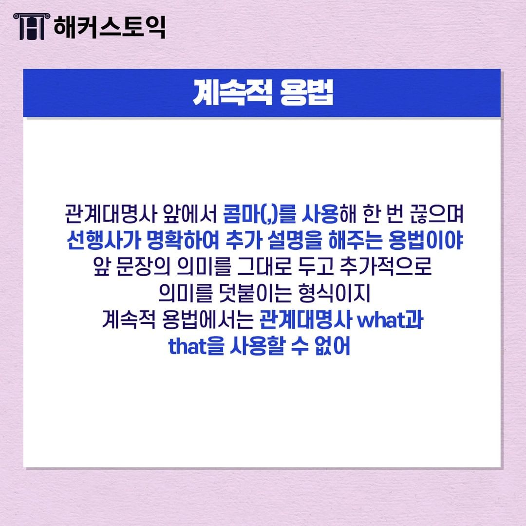 계속적 용법에서는 관계대명사 what과 that을 사용할 수 없어요~