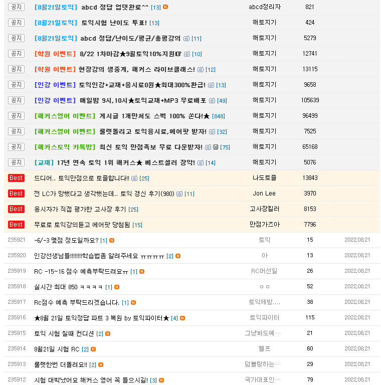 8월 21일 토익시험에 대해 이야기 나누고 싶다면? 토익자유게시판으로 가보아요
