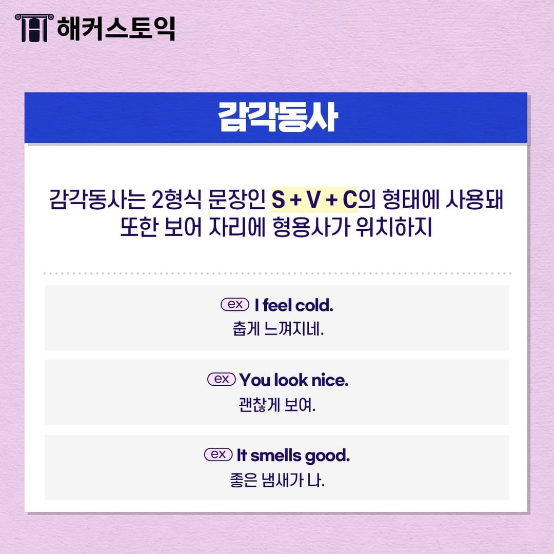 감각동사는 2형식 문장인 S+V+C의 형태에 상용돼요