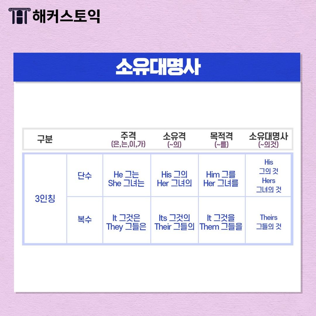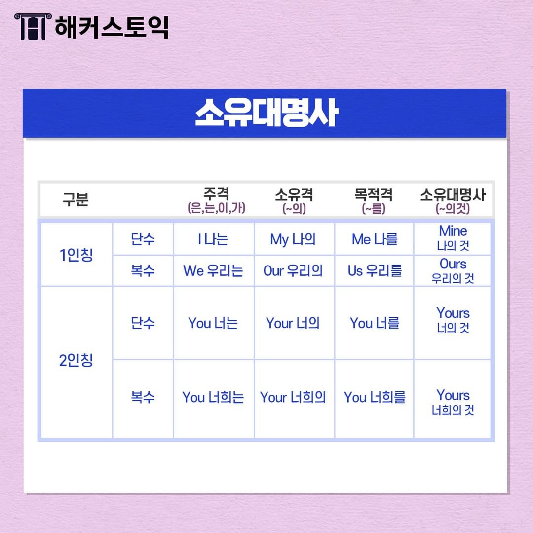 1,2,3인칭 모두 주격, 소유격 목적격, 소유대명사를 외워두면 도움될 거에요