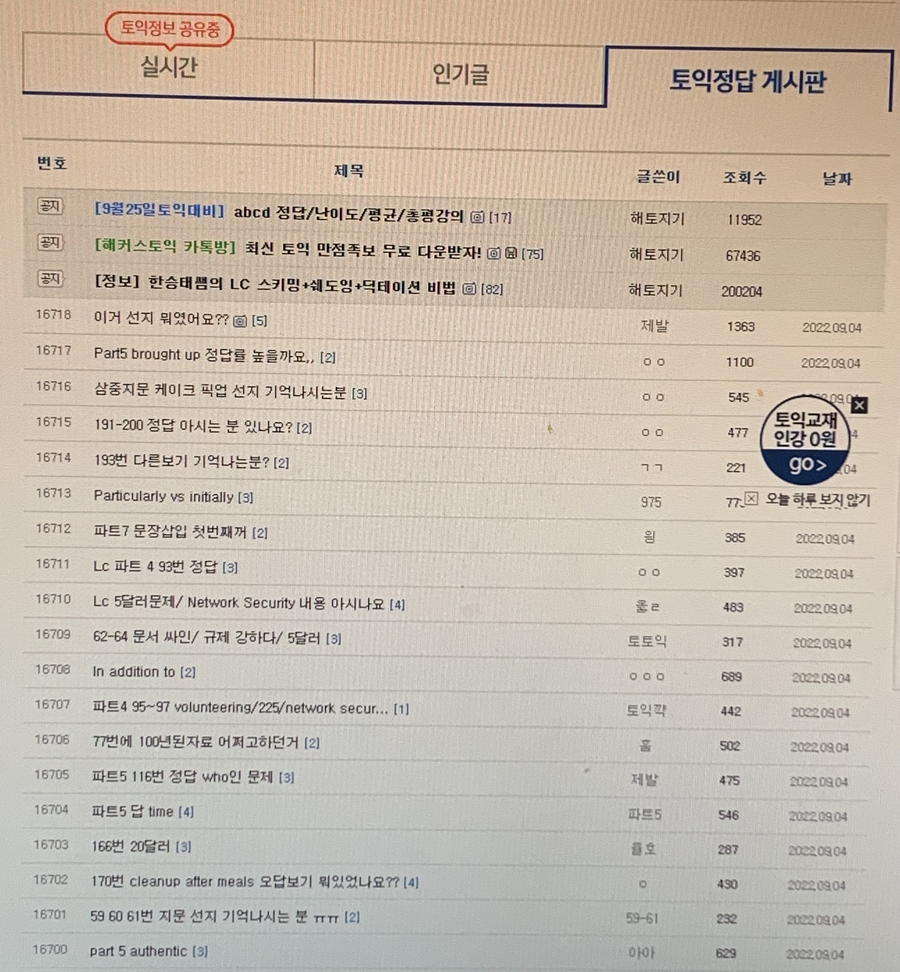 9월 25일 토익 정답에 대한 모든 게시글들을 한 눈에 볼 수 있는 게시판이에요!