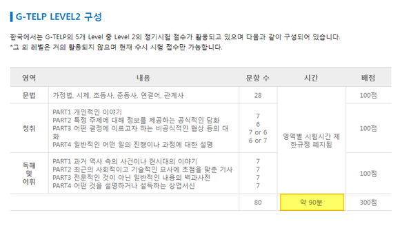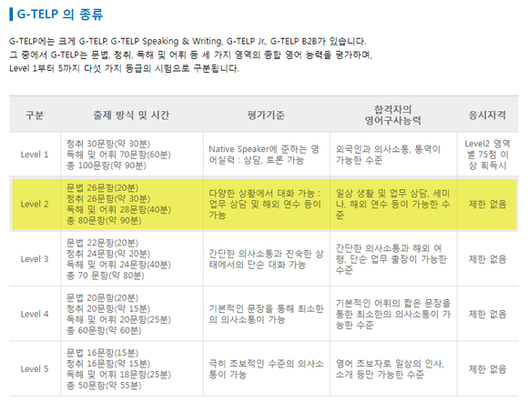 그 중에서 G-TELP는 문법, 청취, 독해 및 어휘 등