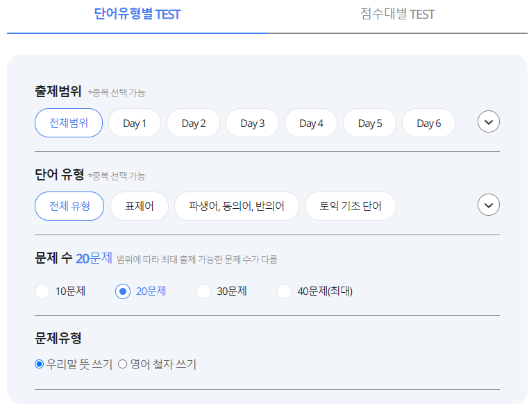 문제 유형 (우리말 뜻 쓰기 / 영어 철자 쓰기) 고르면 돼요!