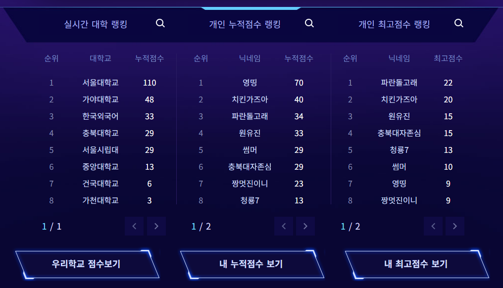 대학별/개인별 단어 문제를 풀면서 점수를 쌓는 게임이에요!