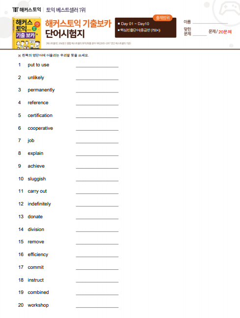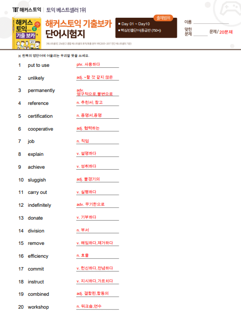 해커스 토익 기출보카 단어 공부했다면 테스트하면서 실력을 점검해보는 게 좋겠죠?