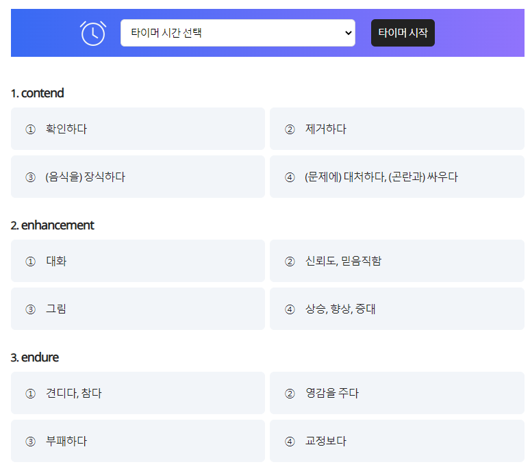 토익 단어가 나오고 그 단어에 맞는 뜻을 고르면서 토익 단어 실력을