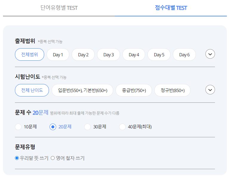출제범위 (Day) / 문제 수(최대 40문제까지)