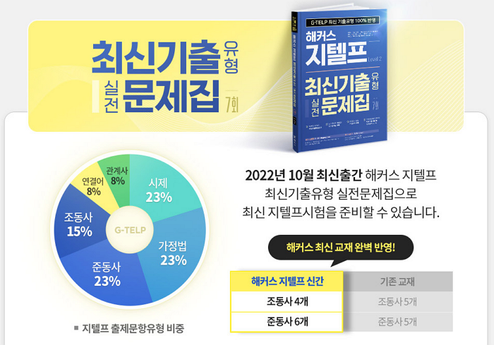 아무래도 지텔프는 떠오르는 시험이기 때문에 어떤 문제가 출제되는지 방향성을 잘 못잡는 친구들이 많아요. 또, 문법/청취/독해&어휘를 모두 평가하고 있기 때문에 시험을 준비하기 위해서는 어떤 문제 유형이 나오는지, 난이도는 어떤지 등을 상세하게 확인하는 것이 좋습니다. 여기서 한가지 공부 팁을 드리자면, 해커스는 시험 주관사인 G-TELP의 기출문제를 독점으로 공개했어요. 최신 기출문제를 독점 출간한 <해커스 지텔프 Level 2 기출문제집>은 지텔프 최신 기출문제 6회분을 수록해서 수험생이 실제 시험 감각을 높일 수 있도록 많은 도움을 주고 있습니다!