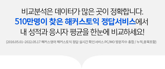 나는 abcd 보고 하나하나 채점 하는 것도 귀찮고 점수 변환도 귀찮다! 하시는 분들은 해커스 토익정답 실시간 확인 서비스를 이용하시는 걸 추천합니다. 이 서비스는 휴대폰번호로 간단하게 가입이 가능합니다. 그리고 내가 적어온 abcd 답을 입력하면 자동으로 채점한 뒤에 토익점수 확인할 수 있는 가상의 성적표까지 제공해주는데요. 여기서 빅데이터를 통한 응시자 평균점수까지 확인이 가능해서 이번토익시험 난이도까지 파악할 수 있습니다. 토익시험 직후에 점수를 확인해야 앞으로 토익시험을 어떻게 준비할 지 계획을 세울 수 있잖아요. 그래서 저는 반드시 시험끝나자마자 토익정답 실시간 확인 서비스를 통해서 토익점수대를 확인하고, 다음시험 준비를 하는게 좋다고 생각합니다. 토익은 그냥 무작정 영어공부만 한다고 점수가 빠르게 오르는 시험은 아니거든요. 철저한 전략을 통해야만 단기간에 점수를 올리고, 빠르게 졸업할 수 있다는 점 명심하세요!