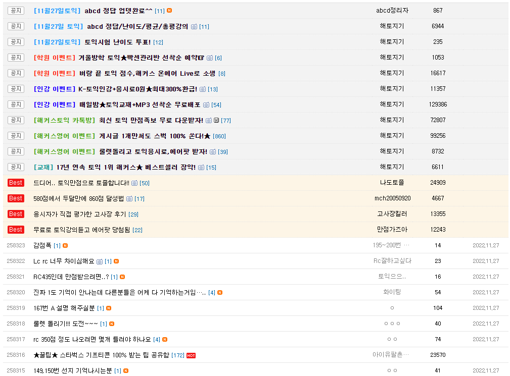 11월 27일 토익시험에 대해 이야기 나누고 싶다면? 토익자유게시판으로 가보아요