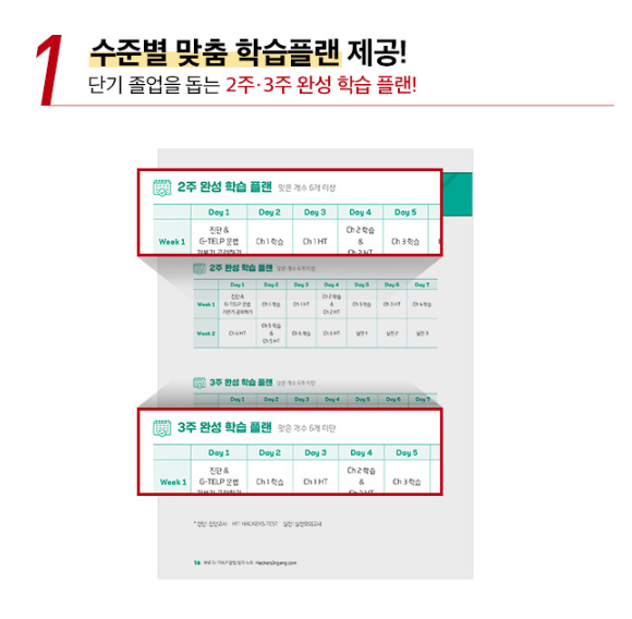 이 책에는 수준별 맞춤 학습 플랜이 나와있어요! 2주와 3주 완성 학습 플랜이 있으니까