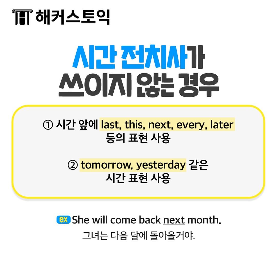 1) 시간 앞에 last, this, next, evey, later 등의 표현 사용