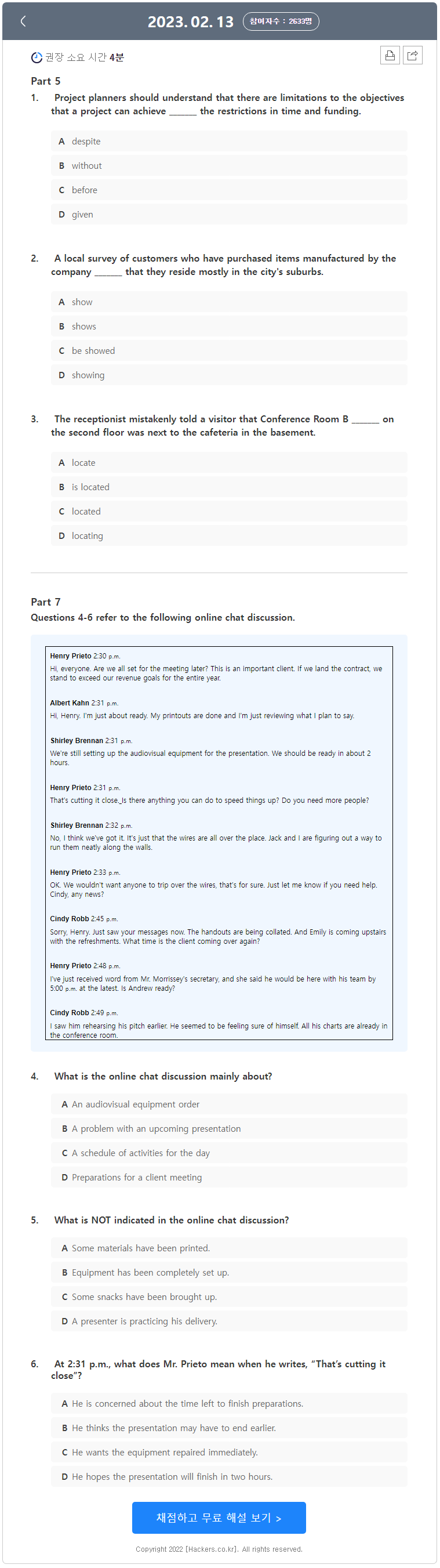 2월 19일 토익 시험에 나올 문제 집어주시고